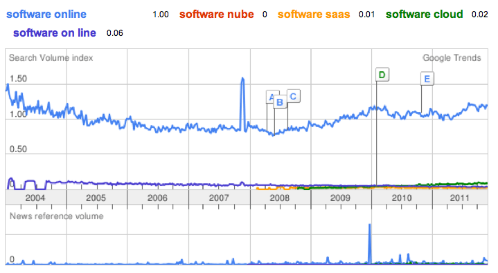- Prueba tus combinaciones en Google Keyword Tool . Por ejemplo, si mi software es en modelo SaaS en la descripción puedo usar: Software online, Software on line, software nube, software saas, software cloud. Con la herramienta de Google puedo hacer un cuadro como el siguiente.